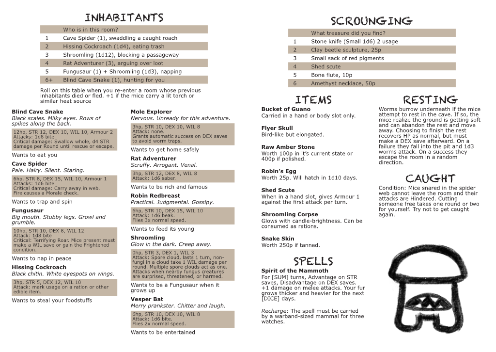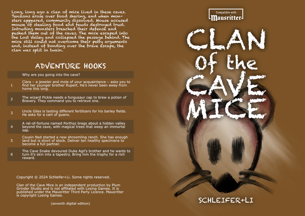Clan of the Cave Mice is an independent production by the Plum Grinder Studio. It is published under the Mausritter Third Party Licence and is not affiliated with Losing Games. Mausritter is copyright Losing Games.